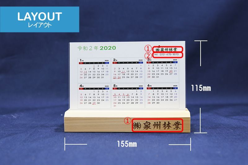 会社名をレーザー彫刻した木製の台座が付属するオリジナル卓上カレンダーです。